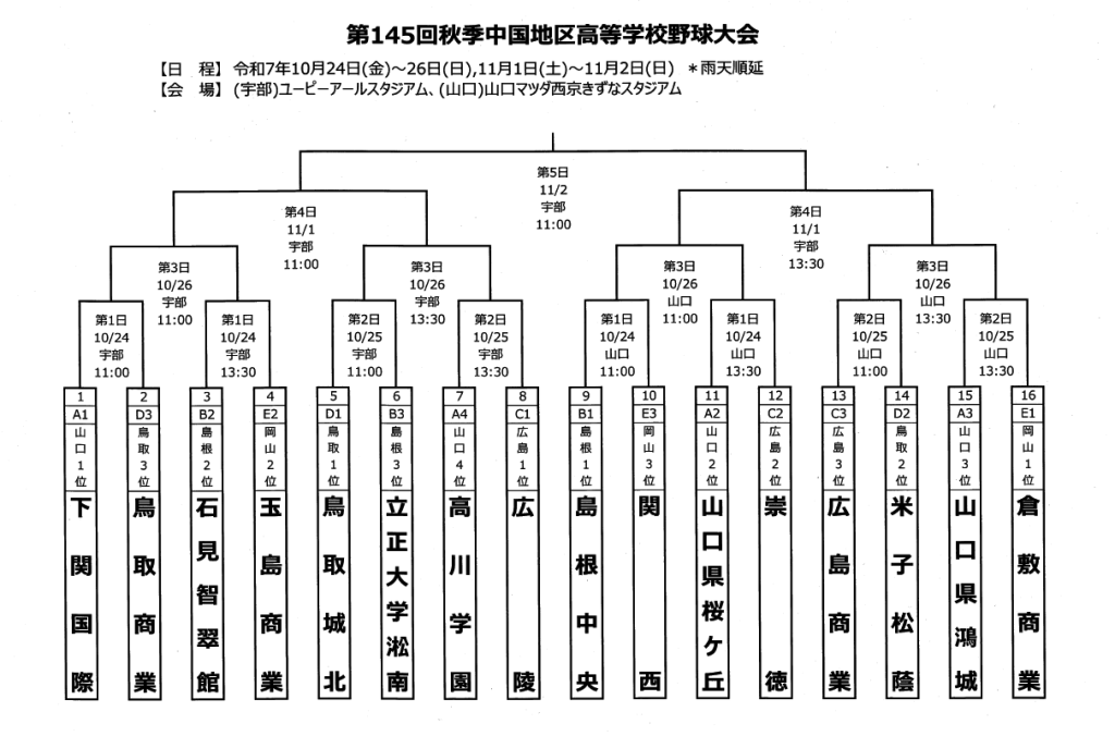 第145回秋季中国地区高校野球大会が、山口マツダ西京きずなスタジアムで開催されます。